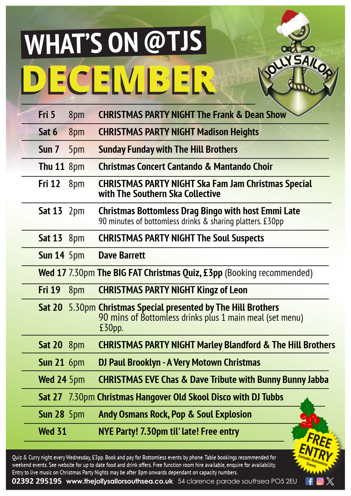 We offer superb food and drinks, live entertainment and music. Our venue space is also available for hire – visit our private hire page for more information. We recommend booking a table in advance for weekend events. Send us a DM on Facebook to reserve or call the pub during opening hours. To book one of our Bottomless events, please call us to pay and secure your place. Please note a minimum spend per table may apply on weekends. Cancellations made less than 48 hours before the booking date are non-refundable for paid events. Follow us on Facebook, or visit our Social Media pages for the latest Jolly Sailor Southsea news.
